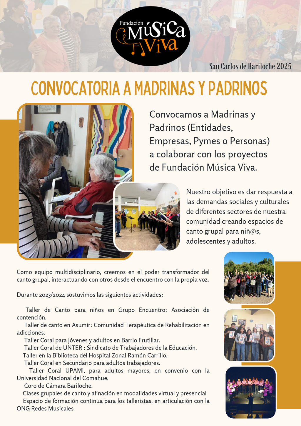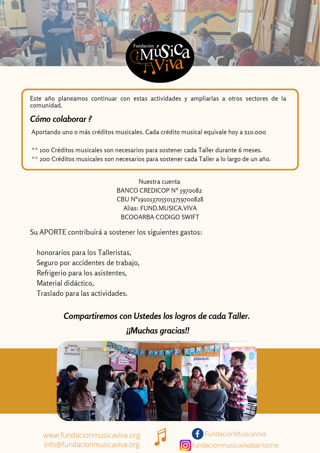 Desde FUNDACION MUSICA VIVA queremos seguir acompañando la creación de talleres de canto en espacios comunitarios. Si niños, niñas, adolescentes y adultos, pueden reconocer su voz y cantar junto a otrxs, es posible generar una mayor conciencia humana a través del arte, el canto y la música.