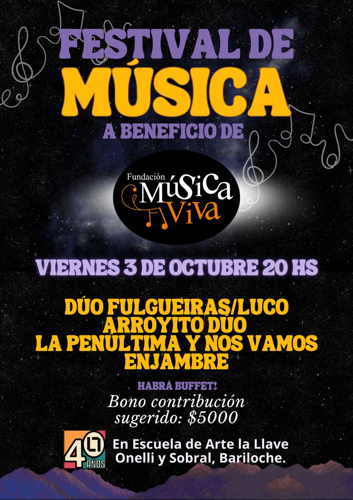El viernes 3 de octubre a partir de las 20hs se presentarán grupos musicales de la ciudad en un Festival a beneficio de Fundación Música Viva, en la Escuela de Arte La Llave. Es el tercer concierto del ciclo donde han participado músicos y agrupaciones de la ciudad.